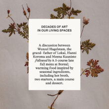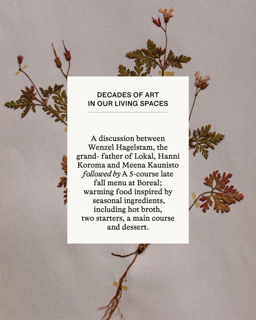 Tekniikka | klo 15: Taide asuintiloissamme kautta vuosikymmenien – keskustelu Lokalin isoisän Wenzel Hagelstamin, Hanni Koroman ja Meena Kauniston välillä. klo 16: Myöhäissyksyn menu isänpäiväksi 9.11. klo 16.00; lämmittäviä, kauden raaka-aineista inspiroituneita ruokia, kuten kuuma liemi, kaksi alkuruokaa, pääruoka ja jälkiruoka. |