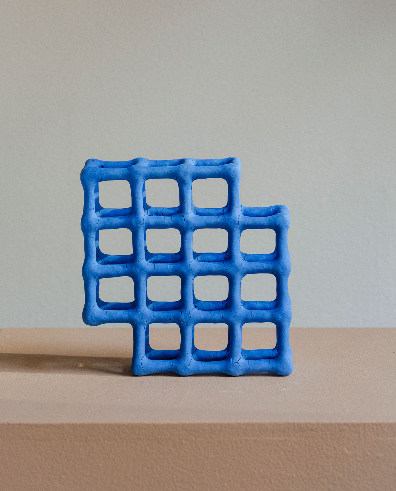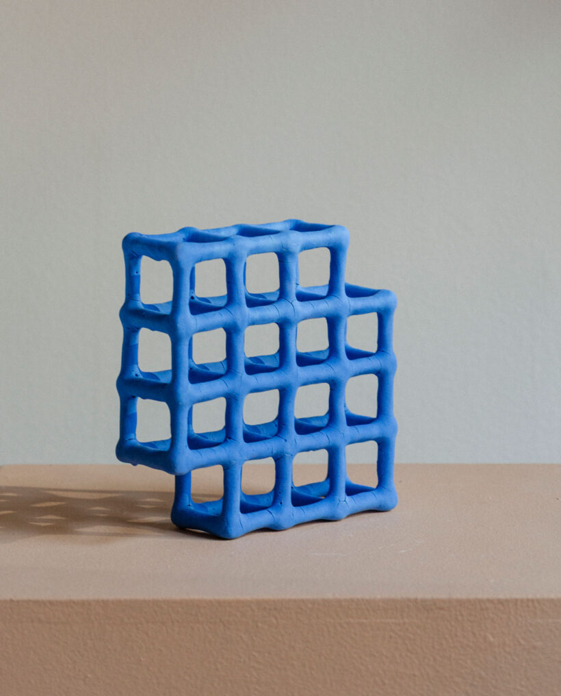 “The grid allows the viewer to see the whole shape by looking through it and fully experiencing it in three dimensions. The works strip down the clay to its bare essentials to be as minimal as possible. By reducing the amount of material things, the existence of space becomes larger, and even the existence of shadows begins to take on greater meaning.”