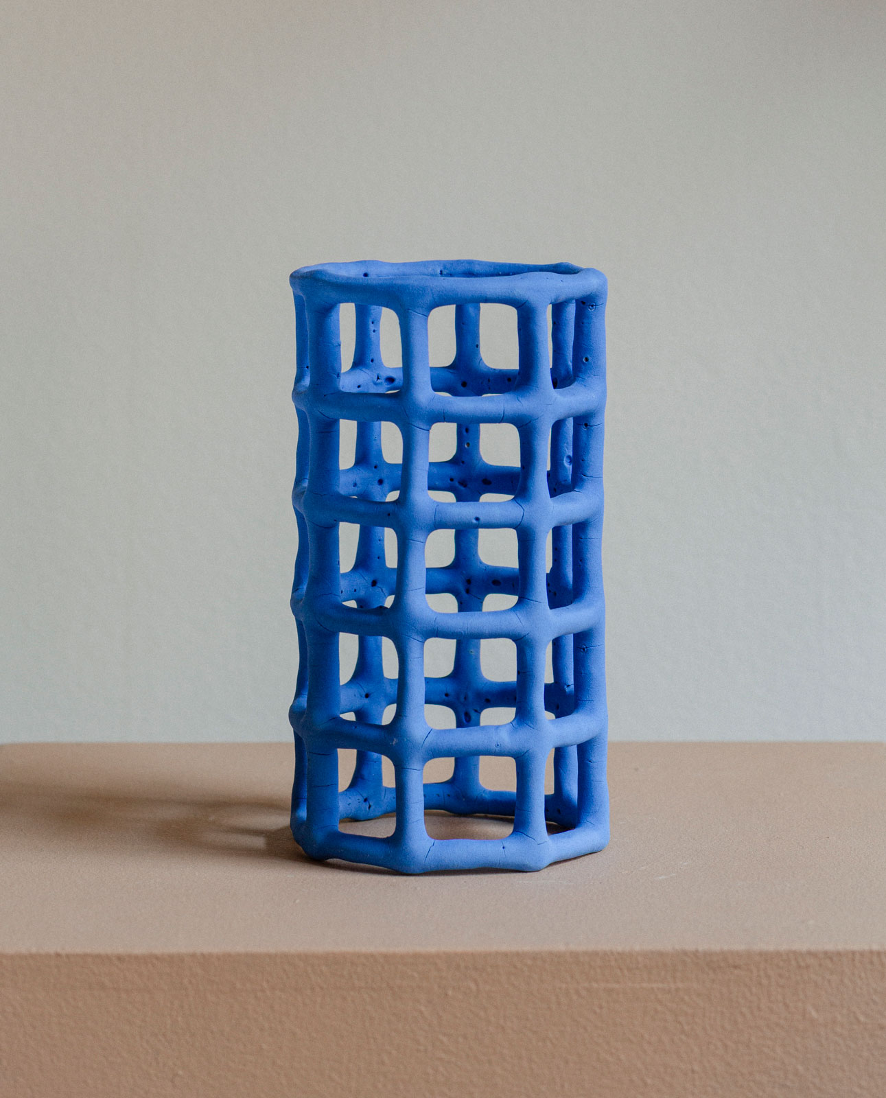 “The grid allows the viewer to see the whole shape by looking through it and fully experiencing it in three dimensions. The works strip down the clay to its bare essentials to be as minimal as possible. By reducing the amount of material things, the existence of space becomes larger, and even the existence of shadows begins to take on greater meaning.”