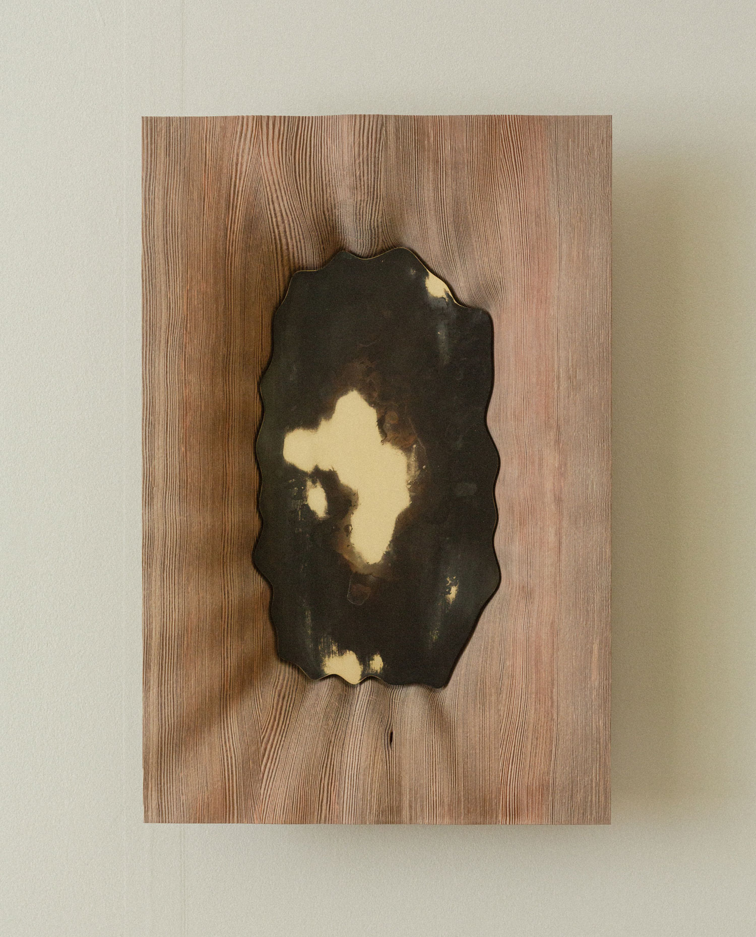 | Year | 2025 | Medium | Pine; woodworking techniques and sandblasting, brass; laser cutting, oxidation and polishing | Size | 60 x 40 x 9 cm |
