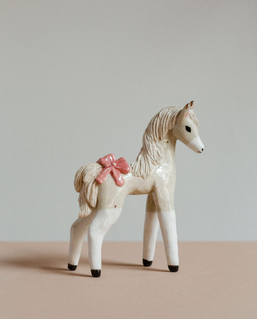 Maisa Majakka (b.1989) is a Helsinki-based visual artist and sculptor. Her figurative ceramic sculptures often depict people, especially girls and women. The works refer to the artist’s own experiences, but also real places, modern phenomena and recognizable figures of popular culture. Majakka is inspired by mundane experiences of freedom, the frantically transformative nature of life, emotional ambivalence and the female point-of-view. The narrative of her works is clear but invites interpretation. Majakka’s career in ceramics begun in 2011 with making her first small ceramic animal figurines. Ever since, they have continued to be a dear and vital part of her practice. The editions of miniature figurines such as dogs, cats and horses contribute to her work as a laboratory of trying out new materials and methods. With the animals, she mixes new bodies of clay and searches for interesting combinations in small scale, in a playful setting.